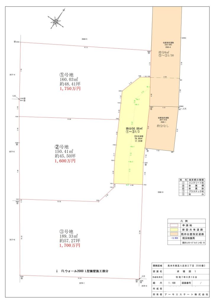 ◆私道負担面積90㎡位置指定道路(現在持分9㎡持分1/30)及び新設共有道路(私道)については56.86㎡(約17.20坪) 持分1/3 それぞれ1~3号地 持分あり